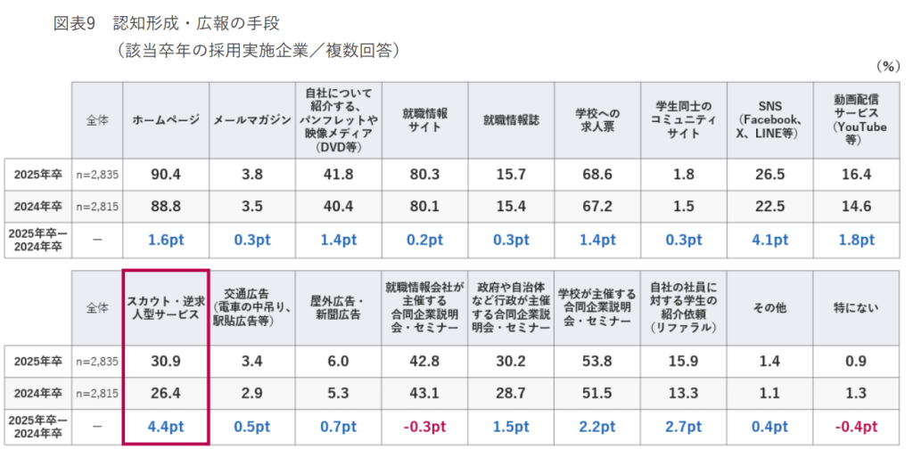 就職みらい研究所の調査によると、新卒採用において認知形成・広報の手段としてスカウト・逆求人サービスを挙げる企業は増加しており、25卒採用では約3割の企業が認知形成・広報の手段として利用していることがわかります。